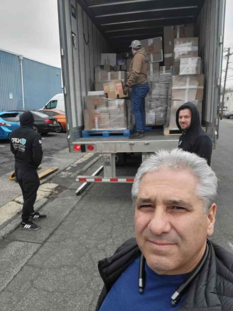 A shipping container being packed with used firefighter gear from various fire departments, as well as humanitarian aid and medical supplies donated by Marblehead High School. The container was shipped from a sea port in New Jersey on March 25, 2022 to Germany, and from Germany it will be directly transported to Rivne, Ukraine.